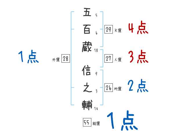 天運![]() | 五百蔵信之輔さんの天運は29画の4つ星!完全主義で才能がある。厳格な心の持ち主。 家系が持つ宿命的な運勢を表します。祖先から受け継いだ苗字ですので自分の力が及びません。家柄を象徴します。 |