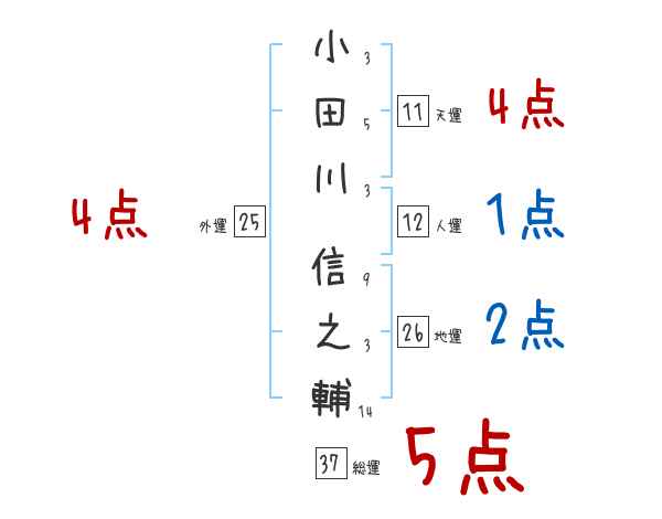 総運![]() | 小田川信之輔さんの総運は37画の5つ星!努力家で順応性に優れる。現実的な考え方ができ忠実に物事をこなす。 あなたの人生を表す1番重要な運勢です。生涯を通じて影響する総合運となり、主に50歳以降の晩年期に影響を及ぼします。 |