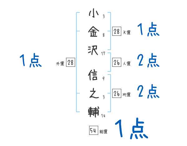 総運![]() | 小金沢信之輔さんの総運は54画の1つ星!トラブルが多いかも。周りをよく見て協調して過ごしましょう。 あなたの人生を表す1番重要な運勢です。生涯を通じて影響する総合運となり、主に50歳以降の晩年期に影響を及ぼします。 |