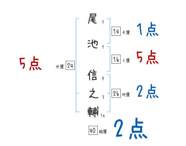 外運![]() | 尾池信之輔さんの外運は24画の5つ星!家庭運が良く順調な人生。金運にも恵まれる。 生活面を象徴する運勢です。外部から受ける影響力を表し、結婚運、家庭運や職場、環境への順応性を表します。 |