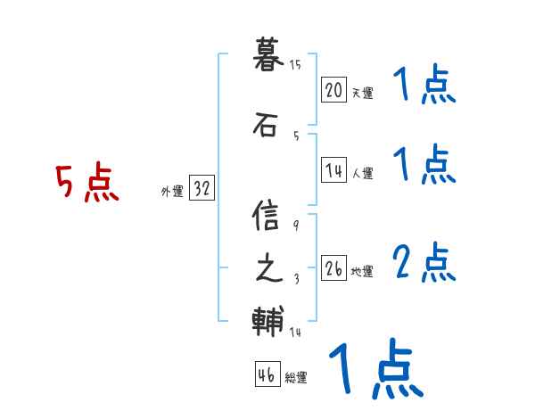 外運![]() | 暮石信之輔さんの外運は32画の5つ星!柔軟性があり成功する。チャンスが多く金運が良い。 生活面を象徴する運勢です。外部から受ける影響力を表し、結婚運、家庭運や職場、環境への順応性を表します。 |