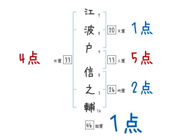 外運![]() | 江波戸信之輔さんの外運は33画の4つ星!権力志向でプライドが高い。勇気があり運を切り開き成功する。 生活面を象徴する運勢です。外部から受ける影響力を表し、結婚運、家庭運や職場、環境への順応性を表します。 |