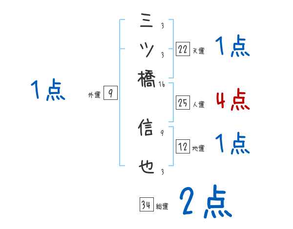 外運![]() | 三ツ橋信也さんの外運は9画の1つ星!消極的で才能を発揮することが苦手なことも。周りの意見に耳を傾けましょう。 生活面を象徴する運勢です。外部から受ける影響力を表し、結婚運、家庭運や職場、環境への順応性を表します。 |