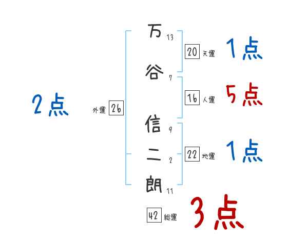 総運![]() | 万谷信二朗さんの総運は42画の3つ星!病気に注意。多芸であるが消極的でおとなしい。 あなたの人生を表す1番重要な運勢です。生涯を通じて影響する総合運となり、主に50歳以降の晩年期に影響を及ぼします。 |