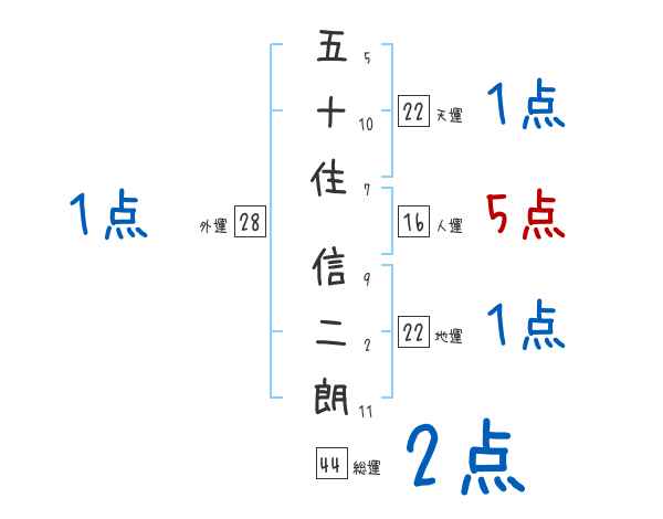 人運![]() | 五十住信二朗さんの人運は16画の5つ星!人望が厚く大きく発展する。逆転成功が見える。 性格や才能などを表す2番目に重要な運勢です。人間関係や協調性、社会的な成功に影響します。主に20歳から50歳ぐらいまでの中年期の運勢を表します。 |