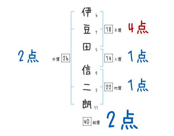 天運![]() | 伊豆田信二朗さんの天運は18画の4つ星!情熱的で剛気。忍耐力があり信頼される。 家系が持つ宿命的な運勢を表します。祖先から受け継いだ苗字ですので自分の力が及びません。家柄を象徴します。 |