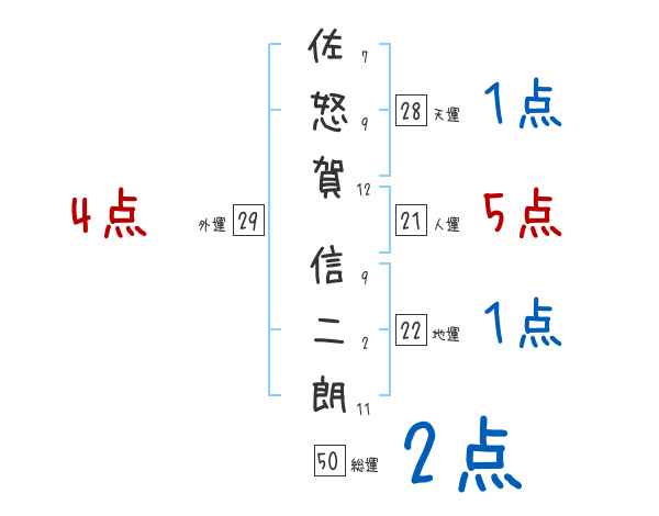 外運![]() | 佐怒賀信二朗さんの外運は29画の4つ星!完全主義で才能がある。厳格な心の持ち主。 生活面を象徴する運勢です。外部から受ける影響力を表し、結婚運、家庭運や職場、環境への順応性を表します。 |