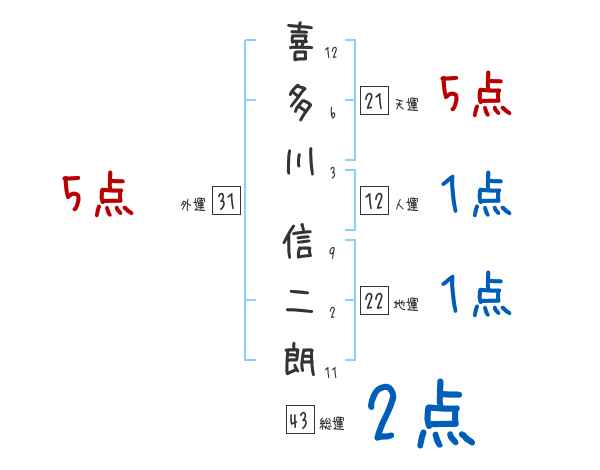総運![]() | 喜多川信二朗さんの総運は43画の2つ星!頑固な性格で独立心が強いかも。やや非現実的で浪費に注意しましょう。 あなたの人生を表す1番重要な運勢です。生涯を通じて影響する総合運となり、主に50歳以降の晩年期に影響を及ぼします。 |