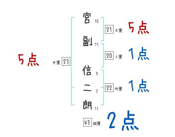 天運![]() | 宮副信二朗さんの天運は21画の5つ星!統率力がある。独立し成功する。名誉を手に入れる。 家系が持つ宿命的な運勢を表します。祖先から受け継いだ苗字ですので自分の力が及びません。家柄を象徴します。 |