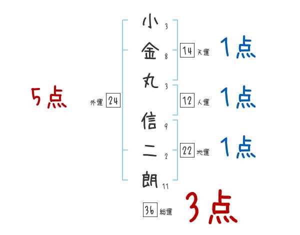 総運![]() | 小金丸信二朗さんの総運は36画の3つ星!先見性が豊かです。多少神経質で苦労することも。 あなたの人生を表す1番重要な運勢です。生涯を通じて影響する総合運となり、主に50歳以降の晩年期に影響を及ぼします。 |