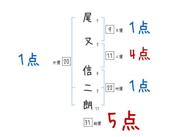 天運![]() | 尾又信二朗さんの天運は9画の1つ星!消極的で才能を発揮することが苦手なことも。周りの意見に耳を傾けましょう。 家系が持つ宿命的な運勢を表します。祖先から受け継いだ苗字ですので自分の力が及びません。家柄を象徴します。 |