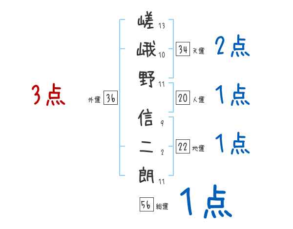 外運![]() | 嵯峨野信二朗さんの外運は36画の3つ星!先見性が豊かです。多少神経質で苦労することも。 生活面を象徴する運勢です。外部から受ける影響力を表し、結婚運、家庭運や職場、環境への順応性を表します。 |