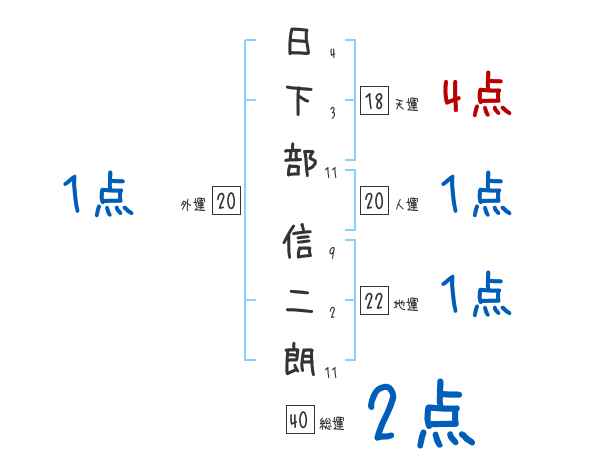 天運![]() | 日下部信二朗さんの天運は18画の4つ星!情熱的で剛気。忍耐力があり信頼される。 家系が持つ宿命的な運勢を表します。祖先から受け継いだ苗字ですので自分の力が及びません。家柄を象徴します。 |