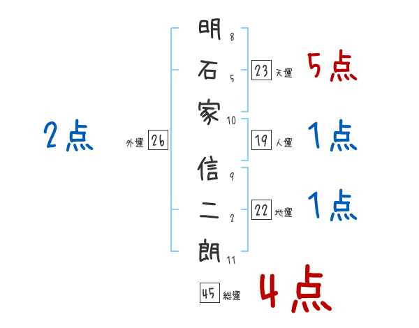 天運![]() | 明石家信二朗さんの天運は23画の5つ星!想像力に優れ活力がある。一代で成功し名誉を手に入れる。 家系が持つ宿命的な運勢を表します。祖先から受け継いだ苗字ですので自分の力が及びません。家柄を象徴します。 |