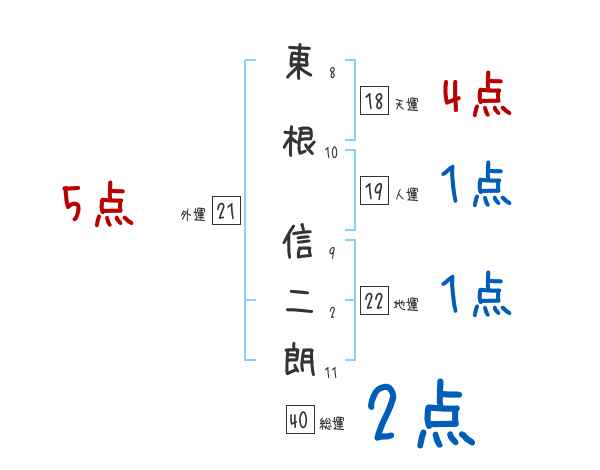 天運![]() | 東根信二朗さんの天運は18画の4つ星!情熱的で剛気。忍耐力があり信頼される。 家系が持つ宿命的な運勢を表します。祖先から受け継いだ苗字ですので自分の力が及びません。家柄を象徴します。 |