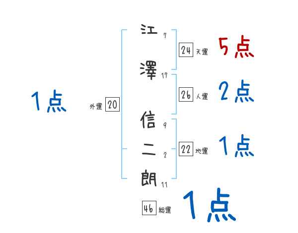 天運![]() | 江澤信二朗さんの天運は24画の5つ星!家庭運が良く順調な人生。金運にも恵まれる。 家系が持つ宿命的な運勢を表します。祖先から受け継いだ苗字ですので自分の力が及びません。家柄を象徴します。 |