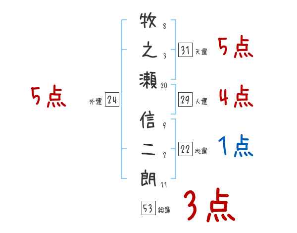 外運![]() | 牧之瀬信二朗さんの外運は24画の5つ星!家庭運が良く順調な人生。金運にも恵まれる。 生活面を象徴する運勢です。外部から受ける影響力を表し、結婚運、家庭運や職場、環境への順応性を表します。 |