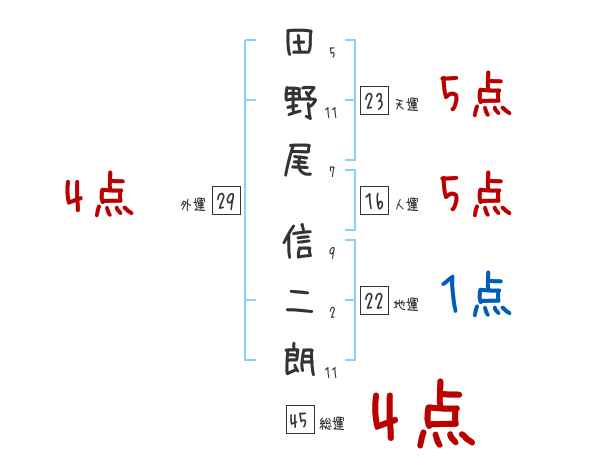 総運![]() | 田野尾信二朗さんの総運は45画の4つ星!もくもくと物事を進め達成する。地味な努力家。 あなたの人生を表す1番重要な運勢です。生涯を通じて影響する総合運となり、主に50歳以降の晩年期に影響を及ぼします。 |