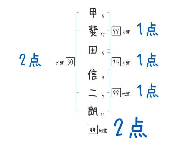 天運![]() | 甲斐田信二朗さんの天運は22画の1つ星!努力することが苦手ないっぽう手先が器用。芸術性にも優れる。 家系が持つ宿命的な運勢を表します。祖先から受け継いだ苗字ですので自分の力が及びません。家柄を象徴します。 |