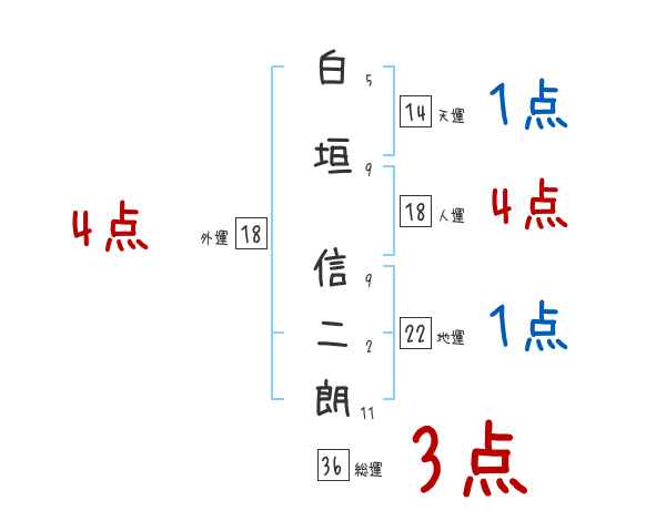 総運![]() | 白垣信二朗さんの総運は36画の3つ星!先見性が豊かです。多少神経質で苦労することも。 あなたの人生を表す1番重要な運勢です。生涯を通じて影響する総合運となり、主に50歳以降の晩年期に影響を及ぼします。 |