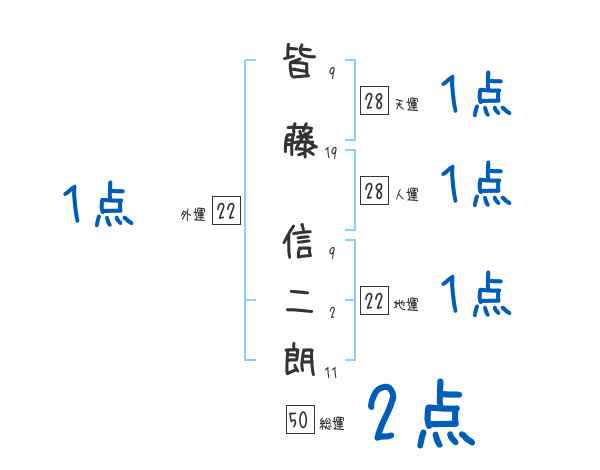 外運![]() | 皆藤信二朗さんの外運は22画の1つ星!努力することが苦手ないっぽう手先が器用。芸術性にも優れる。 生活面を象徴する運勢です。外部から受ける影響力を表し、結婚運、家庭運や職場、環境への順応性を表します。 |