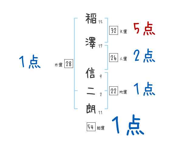 天運![]() | 稲澤信二朗さんの天運は32画の5つ星!柔軟性があり成功する。チャンスが多く金運が良い。 家系が持つ宿命的な運勢を表します。祖先から受け継いだ苗字ですので自分の力が及びません。家柄を象徴します。 |