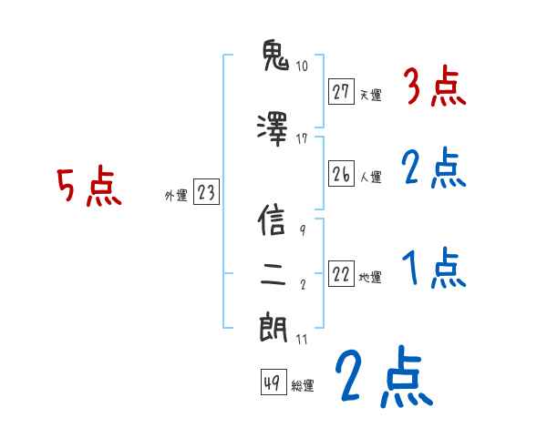 天運![]() | 鬼澤信二朗さんの天運は27画の3つ星!頭脳明晰だが強情で摩擦が多い傾向。孤立に注意。 家系が持つ宿命的な運勢を表します。祖先から受け継いだ苗字ですので自分の力が及びません。家柄を象徴します。 |