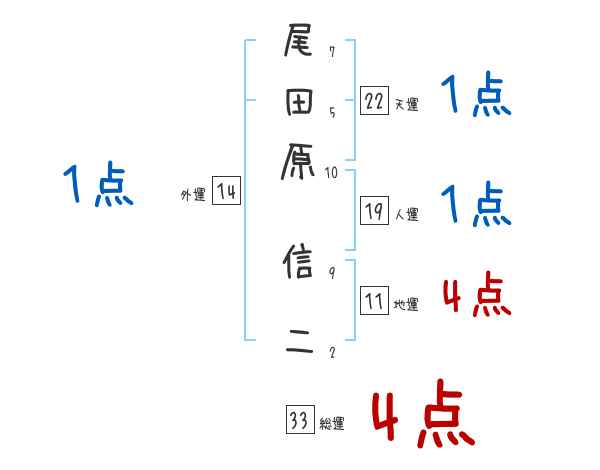 天運![]() | 尾田原信二さんの天運は22画の1つ星!努力することが苦手ないっぽう手先が器用。芸術性にも優れる。 家系が持つ宿命的な運勢を表します。祖先から受け継いだ苗字ですので自分の力が及びません。家柄を象徴します。 |