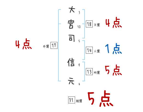 天運![]() | 大宮司信元さんの天運は18画の4つ星!情熱的で剛気。忍耐力があり信頼される。 家系が持つ宿命的な運勢を表します。祖先から受け継いだ苗字ですので自分の力が及びません。家柄を象徴します。 |