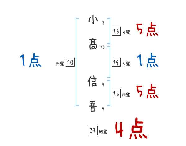 天運![]() | 小髙信吾さんの天運は13画の5つ星!才能に恵まれ人気がある。名声を手に入れる。円満な人生。 家系が持つ宿命的な運勢を表します。祖先から受け継いだ苗字ですので自分の力が及びません。家柄を象徴します。 |