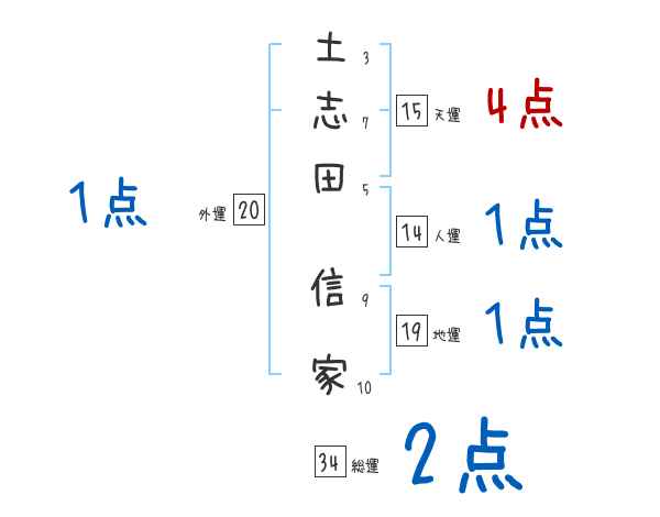 総運![]() | 土志田信家さんの総運は34画の2つ星!独創性に優れるが、自尊心が強く災難に注意しましょう。 あなたの人生を表す1番重要な運勢です。生涯を通じて影響する総合運となり、主に50歳以降の晩年期に影響を及ぼします。 |