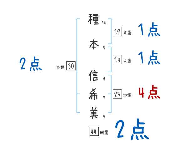 外運![]() | 種本信希美さんの外運は30画の2つ星!浮き沈みの激しさに注意しましょう。 生活面を象徴する運勢です。外部から受ける影響力を表し、結婚運、家庭運や職場、環境への順応性を表します。 |