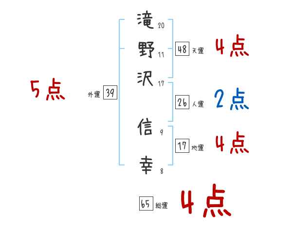 天運![]() | 滝野沢信幸さんの天運は48画の4つ星!賢明な性格で人望が厚い。指導力があり多くの人に尊敬される。 家系が持つ宿命的な運勢を表します。祖先から受け継いだ苗字ですので自分の力が及びません。家柄を象徴します。 |