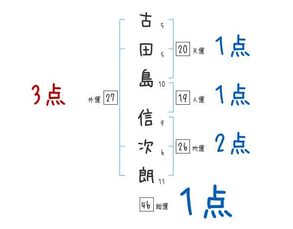 外運![]() | 古田島信次朗さんの外運は27画の3つ星!頭脳明晰だが強情で摩擦が多い傾向。孤立に注意。 生活面を象徴する運勢です。外部から受ける影響力を表し、結婚運、家庭運や職場、環境への順応性を表します。 |
