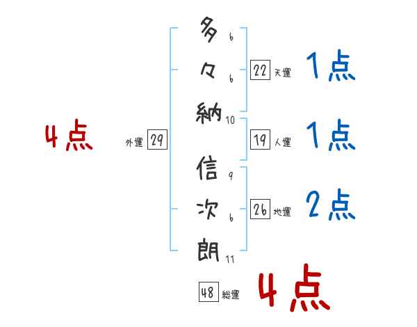 総運![]() | 多々納信次朗さんの総運は48画の4つ星!賢明な性格で人望が厚い。指導力があり多くの人に尊敬される。 あなたの人生を表す1番重要な運勢です。生涯を通じて影響する総合運となり、主に50歳以降の晩年期に影響を及ぼします。 |