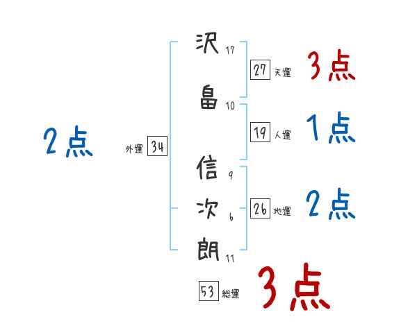 天運![]() | 沢畠信次朗さんの天運は27画の3つ星!頭脳明晰だが強情で摩擦が多い傾向。孤立に注意。 家系が持つ宿命的な運勢を表します。祖先から受け継いだ苗字ですので自分の力が及びません。家柄を象徴します。 |