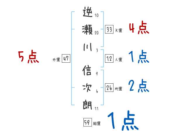 外運![]() | 逆瀬川信次朗さんの外運は47画の5つ星!実力が開花し発展する円満な人生。財に恵まれる。 生活面を象徴する運勢です。外部から受ける影響力を表し、結婚運、家庭運や職場、環境への順応性を表します。 |