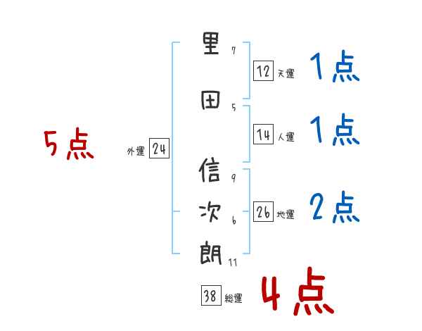 外運![]() | 里田信次朗さんの外運は24画の5つ星!家庭運が良く順調な人生。金運にも恵まれる。 生活面を象徴する運勢です。外部から受ける影響力を表し、結婚運、家庭運や職場、環境への順応性を表します。 |