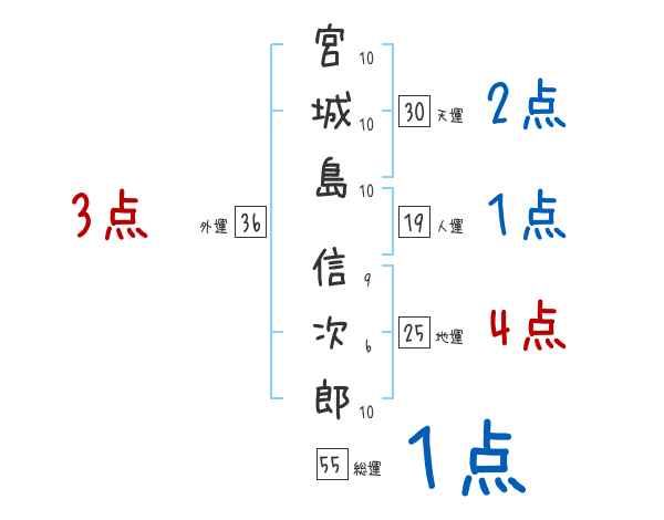 天運![]() | 宮城島信次郎さんの天運は30画の2つ星!浮き沈みの激しさに注意しましょう。 家系が持つ宿命的な運勢を表します。祖先から受け継いだ苗字ですので自分の力が及びません。家柄を象徴します。 |