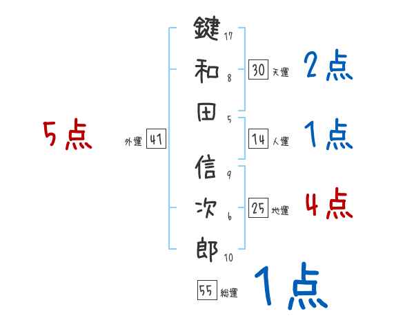 外運![]() | 鍵和田信次郎さんの外運は41画の5つ星!大志を抱き、目標に向かって実力を発揮し達成する。温和な性格。 生活面を象徴する運勢です。外部から受ける影響力を表し、結婚運、家庭運や職場、環境への順応性を表します。 |