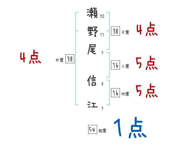 人運![]() | 瀬野尾信江さんの人運は16画の5つ星!人望が厚く大きく発展する。逆転成功が見える。 性格や才能などを表す2番目に重要な運勢です。人間関係や協調性、社会的な成功に影響します。主に20歳から50歳ぐらいまでの中年期の運勢を表します。 |