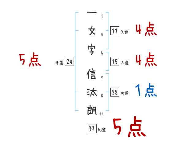総運![]() | 一文字信汰朗さんの総運は39画の5つ星!社交性に優れ人望が厚い。人の上に立ち成功する。 あなたの人生を表す1番重要な運勢です。生涯を通じて影響する総合運となり、主に50歳以降の晩年期に影響を及ぼします。 |