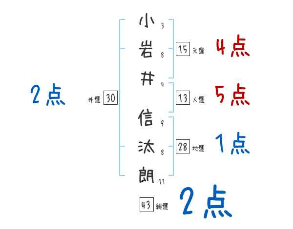 外運![]() | 小岩井信汰朗さんの外運は30画の2つ星!浮き沈みの激しさに注意しましょう。 生活面を象徴する運勢です。外部から受ける影響力を表し、結婚運、家庭運や職場、環境への順応性を表します。 |