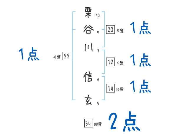 外運![]() | 栗谷川信玄さんの外運は22画の1つ星!努力することが苦手ないっぽう手先が器用。芸術性にも優れる。 生活面を象徴する運勢です。外部から受ける影響力を表し、結婚運、家庭運や職場、環境への順応性を表します。 |