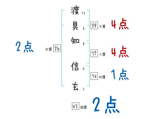 外運![]() | 渡具知信玄さんの外運は26画の2つ星!波瀾万丈かも。信頼できる人を大事にしましょう。 生活面を象徴する運勢です。外部から受ける影響力を表し、結婚運、家庭運や職場、環境への順応性を表します。 |