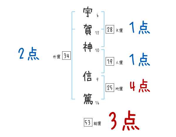 天運![]() | 宇賀神信篤さんの天運は28画の1つ星!家庭環境に注意。スポーツで活躍できる能力があるかも。 家系が持つ宿命的な運勢を表します。祖先から受け継いだ苗字ですので自分の力が及びません。家柄を象徴します。 |