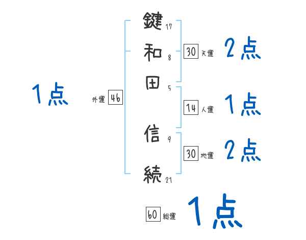 天運![]() | 鍵和田信続さんの天運は30画の2つ星!浮き沈みの激しさに注意しましょう。 家系が持つ宿命的な運勢を表します。祖先から受け継いだ苗字ですので自分の力が及びません。家柄を象徴します。 |