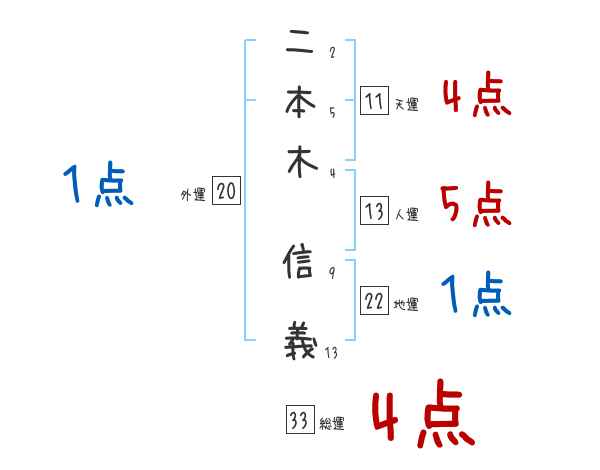 人運![]() | 二本木信義さんの人運は13画の5つ星!才能に恵まれ人気がある。名声を手に入れる。円満な人生。 性格や才能などを表す2番目に重要な運勢です。人間関係や協調性、社会的な成功に影響します。主に20歳から50歳ぐらいまでの中年期の運勢を表します。 |