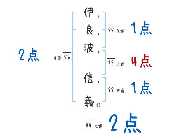 総運![]() | 伊良波信義さんの総運は44画の2つ星!誠実で慎重な性格。物事を考えすぎないように注意しましょう。 あなたの人生を表す1番重要な運勢です。生涯を通じて影響する総合運となり、主に50歳以降の晩年期に影響を及ぼします。 |