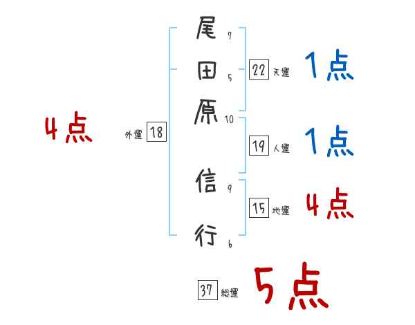 天運![]() | 尾田原信行さんの天運は22画の1つ星!努力することが苦手ないっぽう手先が器用。芸術性にも優れる。 家系が持つ宿命的な運勢を表します。祖先から受け継いだ苗字ですので自分の力が及びません。家柄を象徴します。 |